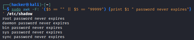 2. awk -F: '$3 >= 1000 {print $1}' /etc/passwd | xargs -I {} chage -l {}